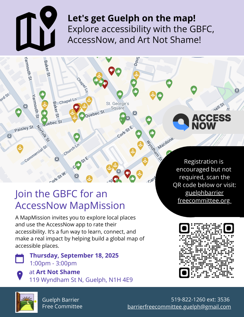 A MapMission is a community-led event where you’ll explore local places and share information about their accessibility. Using the AccessNow app (with a quick demonstration from the Guelph Barrier Free Committee first), you’ll help highlight accessibility features of your favourite Guelph spots.
